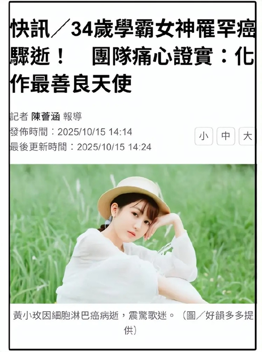在娱乐圈这个永远不缺话题的舞台上,10月15日的一则讣告如同一颗重磅炸弹,瞬间炸开了舆论的波澜——年仅34岁的歌手黄小玫因罕见病“NK/T细胞淋巴癌”永远地离开了这个世界。这个消息,就像一场突如其来的暴风雨