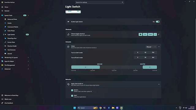 而“Light Switch”功能正如其名,允许用户根据日出和日落时间(基于地理位置)或自定义的时间表,在Windows 11的深色和日间模式间自动切换。