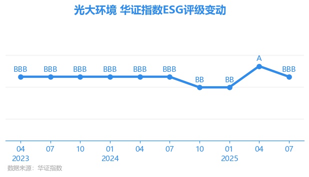 日前,华证指数公布了新一期(2025年7月31日)的ESG评级结果,光大环境(00257.HK)获得BBB评级(华证指数评级为C起至AAA九档,C为最低档,AAA为其最高一级评级/AA为其第二档),上一期(2025年4月30日)ESG评级为A。本期ESG评级在8家商业服务与商业用品行业港股上市公司中排名第2(上一期排名第4)。