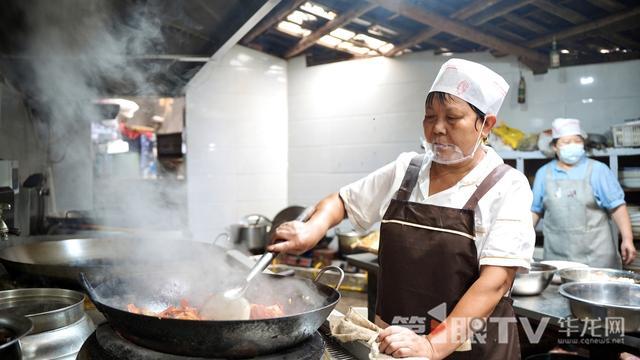 店里的帮厨阿姨肖木容正在炒菜。
