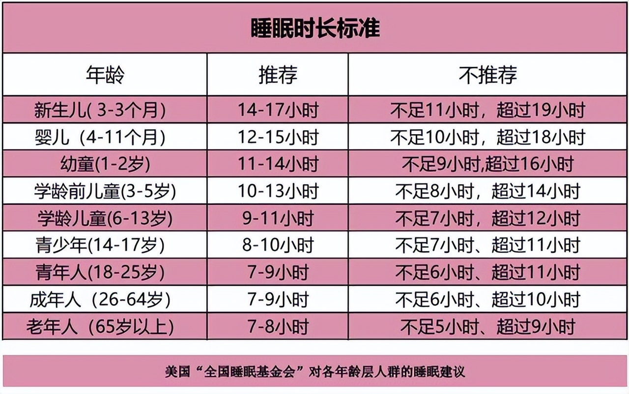 美国国家睡眠基金会建议:小学生需要9-11小时的睡眠时间,初中生则为8-10小时,高中生为7-9小时。