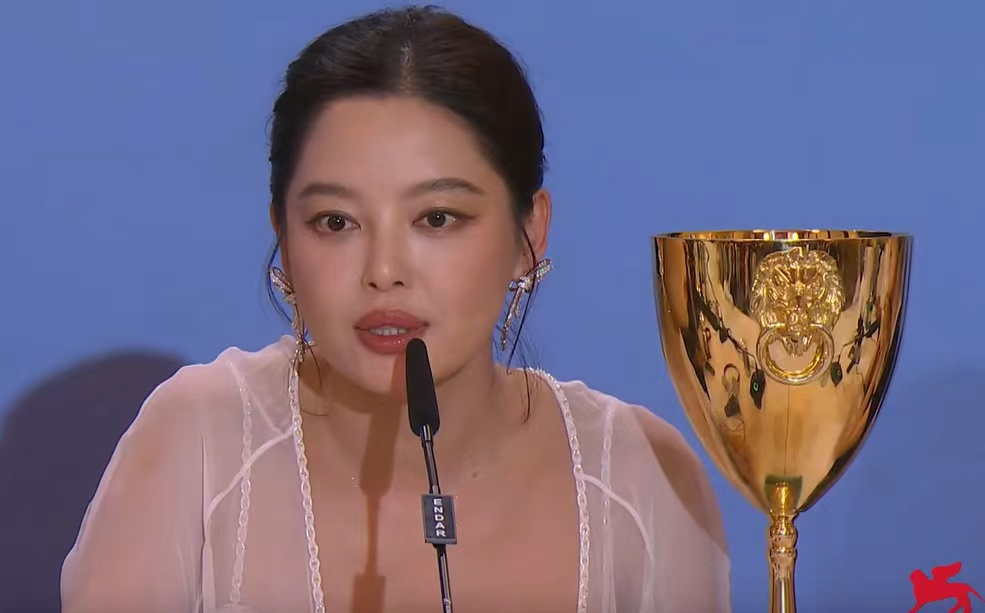 辛芷蕾用中文发表获奖感言,她可能没有像其他演员一样学习英文,她非常感谢威尼斯国际电影节能把这个奖颁给她,感谢所有的评委老师们能喜欢她的表演,喜欢她的电影。