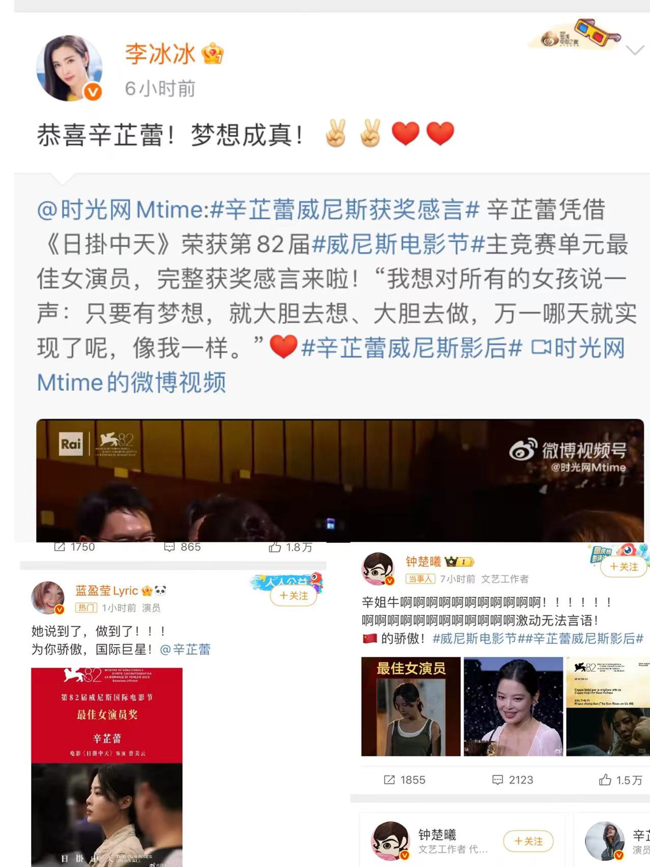 辛芷蕾夺威尼斯影后梦想成真,李冰冰钟楚曦等发文祝贺