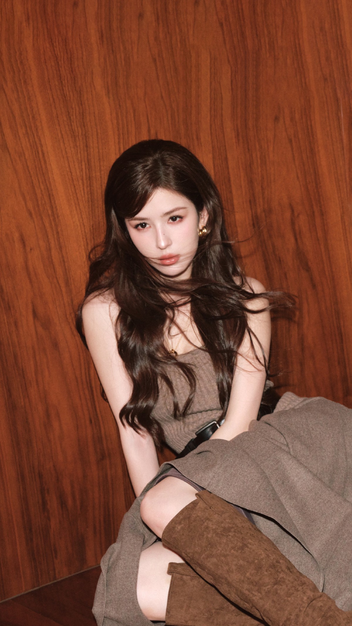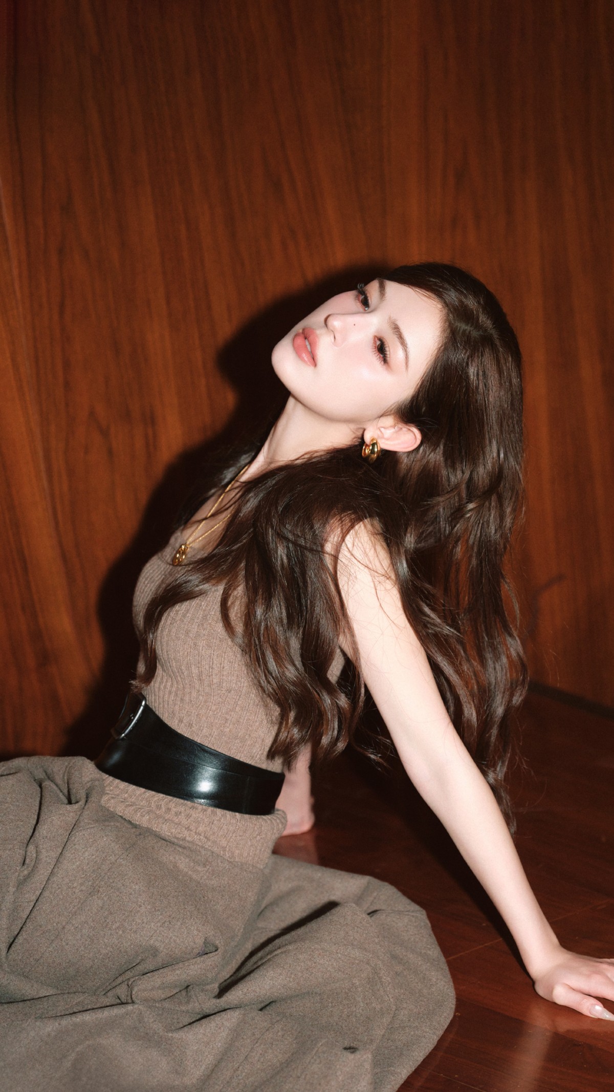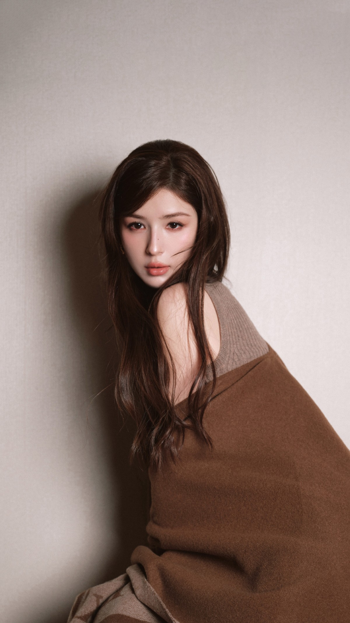 焦糖棕色系宛如秋日的专属符号,温暖而醇厚。哈妮克孜的这身穿搭,仿佛将糖炒栗子的香甜软糯穿在了身上,给人以温馨惬意的视觉感受。宽松的披衫随风轻扬,发丝也肆意飞舞,营造出一种随性又慵懒的氛围。她无需过多修饰,仅以简约的耳环点缀,便将那份自然纯粹的美展现得淋漓尽致。