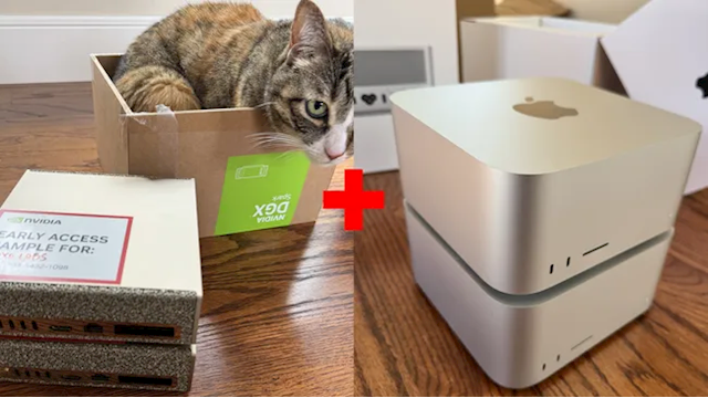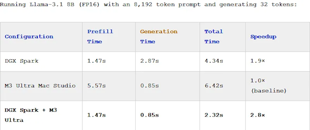 在EXO的最新演示中,两台NVIDIA DGX Spark与苹果的Mac Studio被组合在一起,以充分利用了每台机器的独特优势。