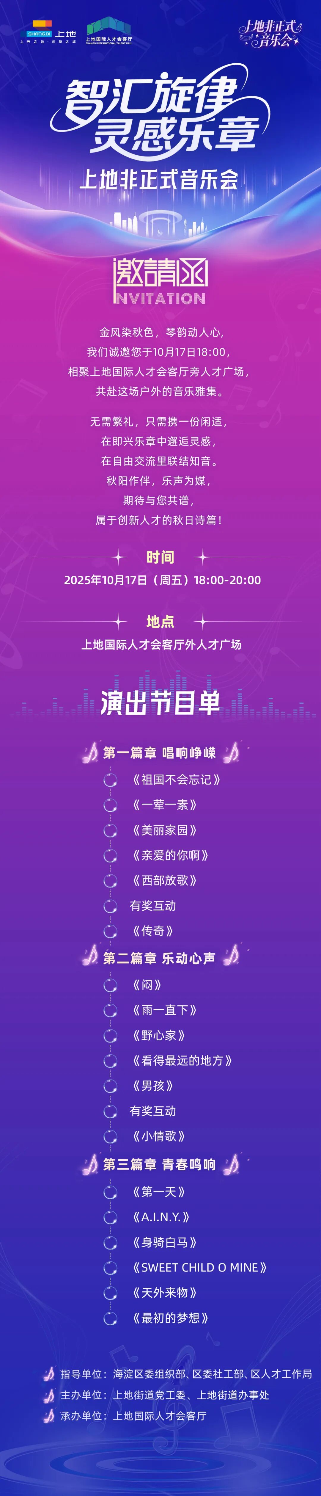 据了解,此次音乐会由上地街道党工委、办事处主办,旨在进一步丰富辖区企业员工业余文化生活,营造开放包容、活力共享的地区氛围。节目内容轻松多元,涵盖《祖国不会忘记》《雨一直下》《最初的梦想》等多个经典与现代曲目,现场还将设有互动环节,氛围轻松自由。