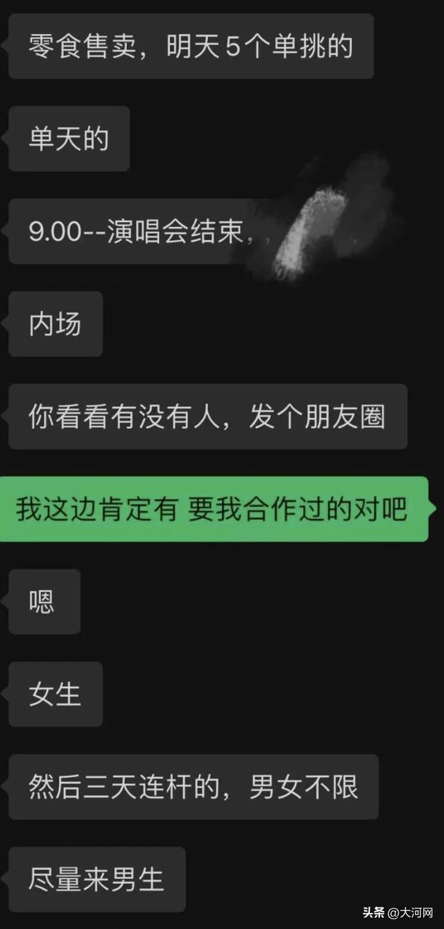 为核实真伪,记者通过几条招聘信息加入了多个所谓的“五月天演唱会兼职群”。群内仍有管理员在发布相关岗位,其中一位“群头”在朋友圈晒出“五月天演唱会卖零食”的兼职内容,并附上与“需求方”的聊天截图,标注了工作时间、报酬等细节,以此证明招聘“真实有效”。