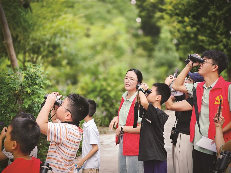 室内学习意犹未尽,亲子家庭随即跟随导师开启户外探索。“快听!那边有鸟叫!”一名孩子压低声音的兴奋呼喊,让现场瞬间安静下来。在导师“先听声辨位,再寻踪辨形”的引导下,大家仰头凝神,仔细探寻声音来源。很快,灵动的鸟类身影陆续出现:头顶白色、叽叽喳喳跳跃的白头鹎,头顶耸立一撮红色羽毛的红耳鹎,还有一道翠绿身影倏地掠过的叉尾太阳鸟。这些“飞羽精灵”时而跃上枝头,时而钻入叶间,仿佛在与孩子们玩一场自然的捉迷藏。灵动的鸟儿不时出现,孩子们一边对照手册辨认特征,一边认真记录,化身“小小鸟类科学家”。