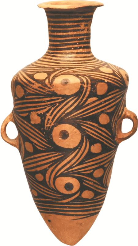 其次,马家窑文化彩陶造型最为丰富。马家窑文化遗址出土的陶器采用泥质与夹砂两种材质制作,主要由泥条盘筑结合捏塑工艺成型。根据地层堆积,可分早、中、晚三个发展阶段:早期马家窑文化彩陶器型以碗、钵、盆等饮食器为主,但储藏类器型如罐、瓮、壶及尖底瓶数量逐渐增加。其中最具代表性的造型就是旋纹双耳尖底瓶,兼具实用功能与审美价值。半山时期,碗、盆等传统器型继续存在,大型储藏器如壶、瓮、瓶、罐等逐渐成为主流。马厂阶段的彩陶器型逐渐丰富,除延续前一时期器型外,出现了单耳带鋬筒状杯、盘形豆、短颈高腹杯等新型器物。我国彩陶器型至此已基本完备,与后世相比并无多大差别,可以通过这些彩陶器型看到马家窑文化时期生产生活的发展水平。