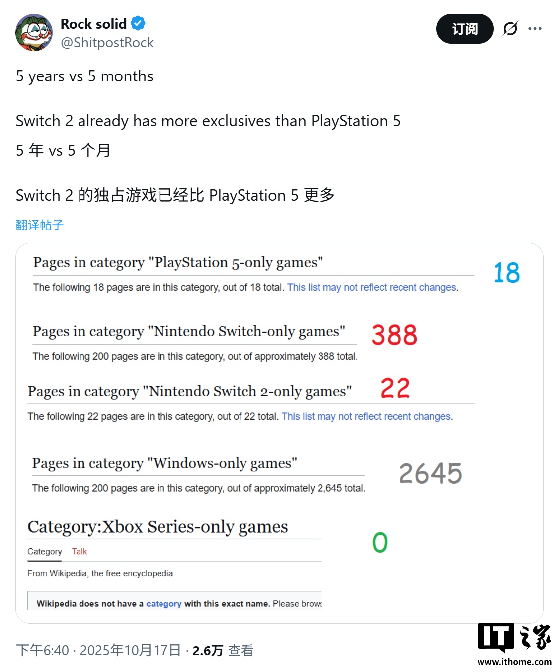 IT之家 10 月 18 日消息,网友 @ShitpostRock 昨日(10 月 17 日)在 X 平台发布推文,称基于维基百科数据,任天堂用 5 个月时间,Switch 2 独占游戏数量(22 款)已反超发行约 5 年的索尼 PlayStation 5(18 款)。 该网友查询维基百