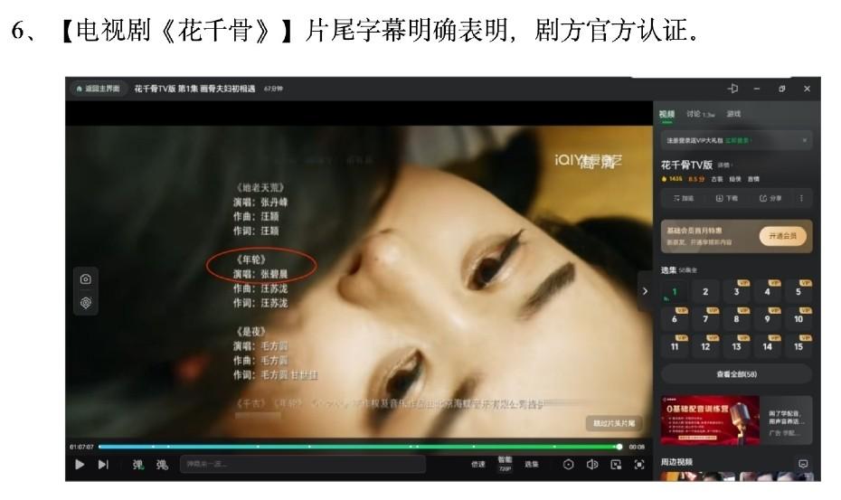 证据中包括歌曲发行时间,以及电视剧《花千骨》在片尾时对ost原唱的标注等等。