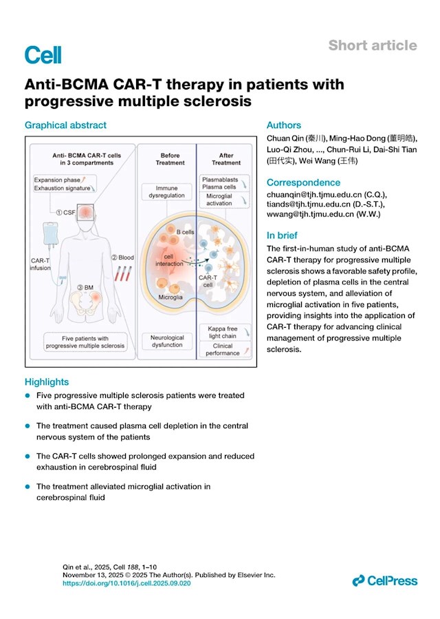 他们全球首次证实“自体靶向B细胞成熟抗原的CAR-T细胞疗法”可安全有效对抗进展型多发性硬化,为这一困扰全球的青壮年致残疾病带来突破性治疗方案,彻底颠覆传统药物 “治标不治本” 的困局。