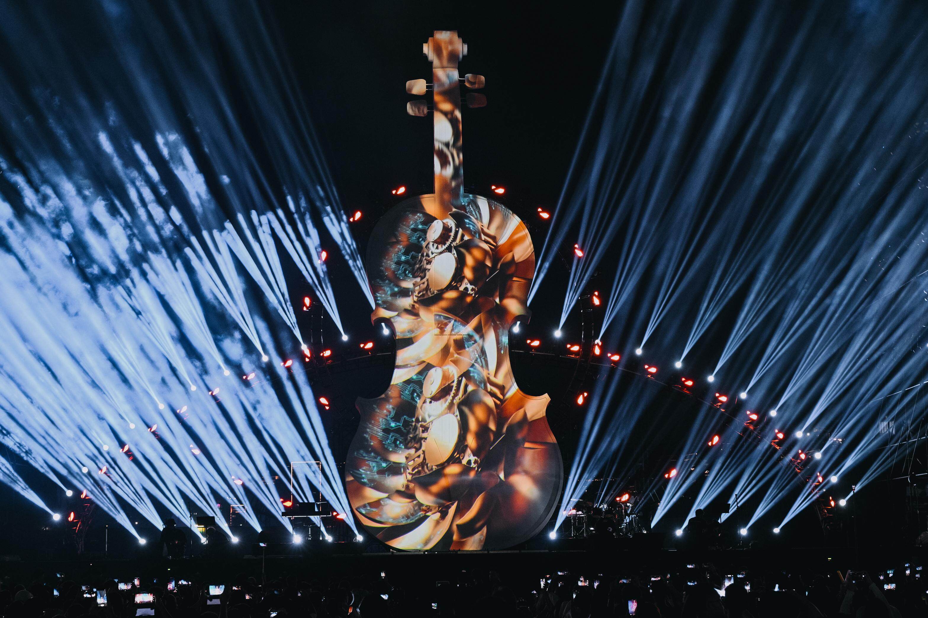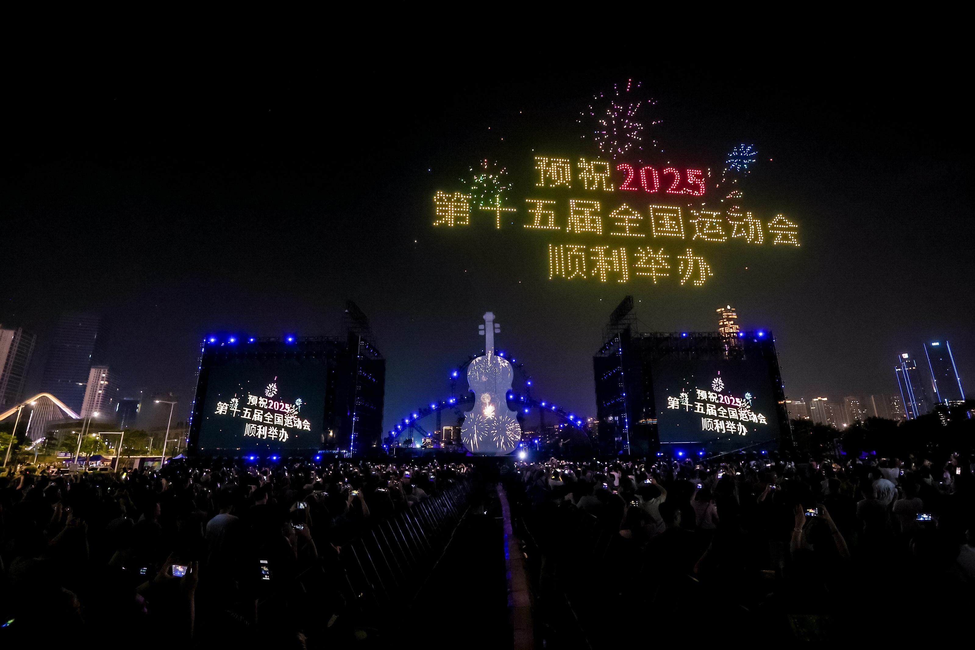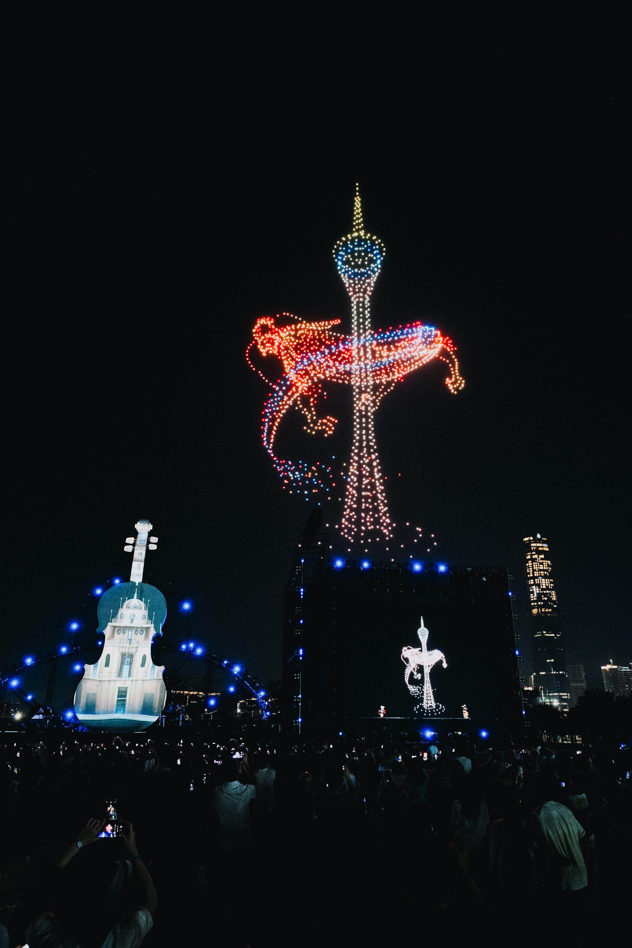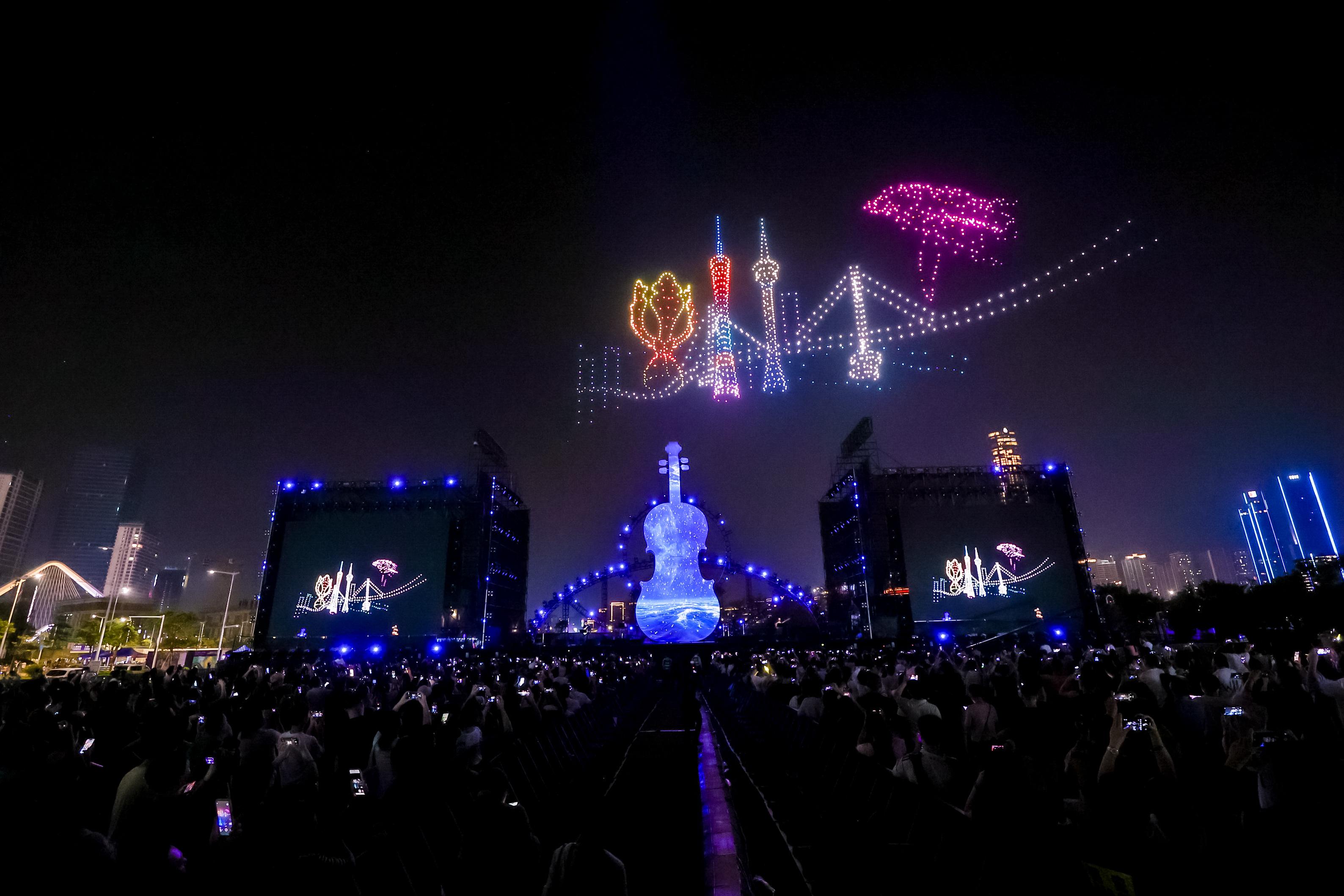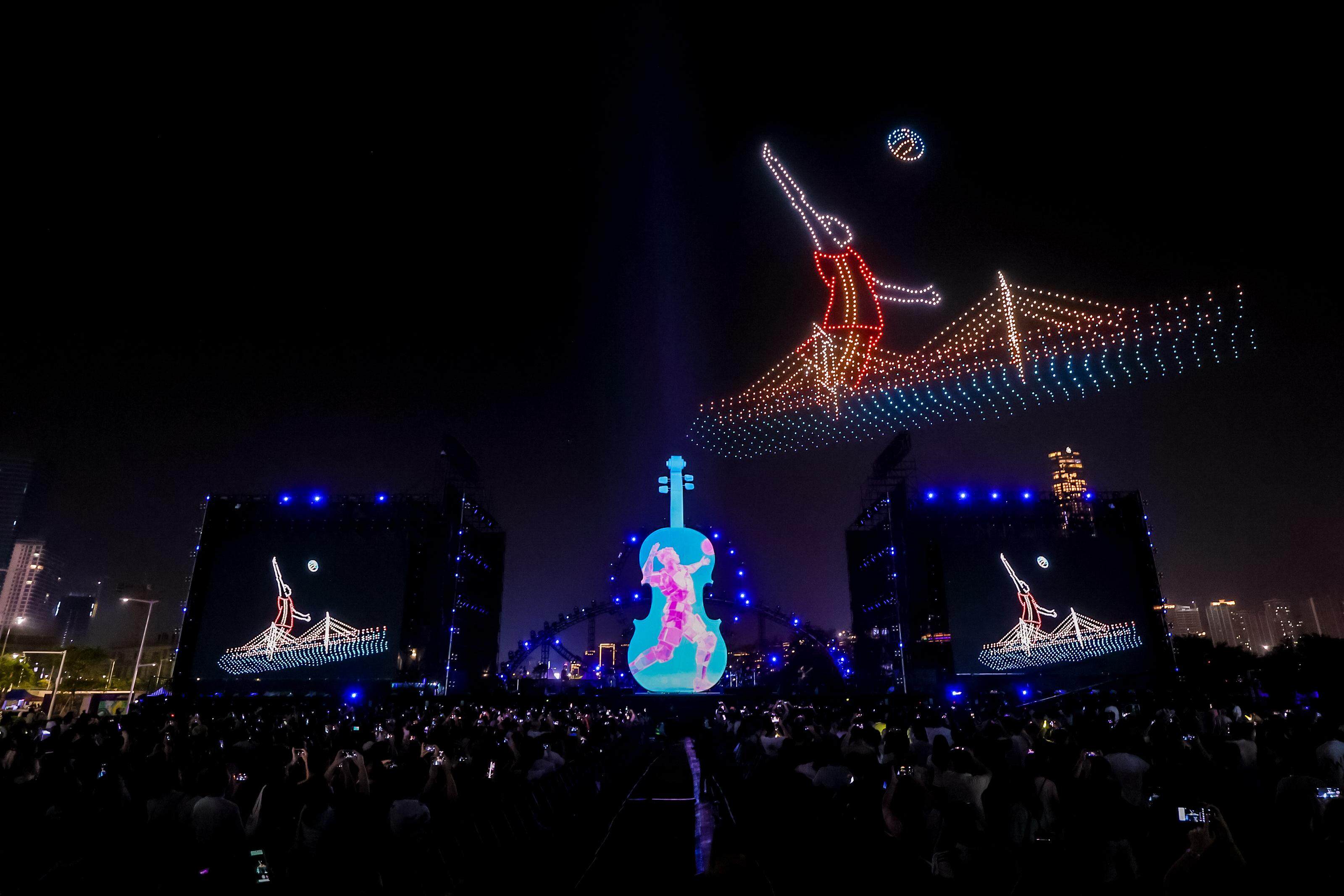 现场定制一把高达20米的“小提琴”艺术装置,在白天作为景观供打卡拍照,夜晚则结合光影效果,成为演出的核心载体。2000架无人机于十字门水道上方升空,形成了约3万平方米的“空中光影剧场”,依次呈现出粤港澳大湾区地标建筑、横琴天沐琴台、澳门特色街巷、横琴和澳门赛区承接的体育赛事项目、十五运会吉祥物等图案,展现出横琴与澳门共同筹备盛事的热情与创意。
