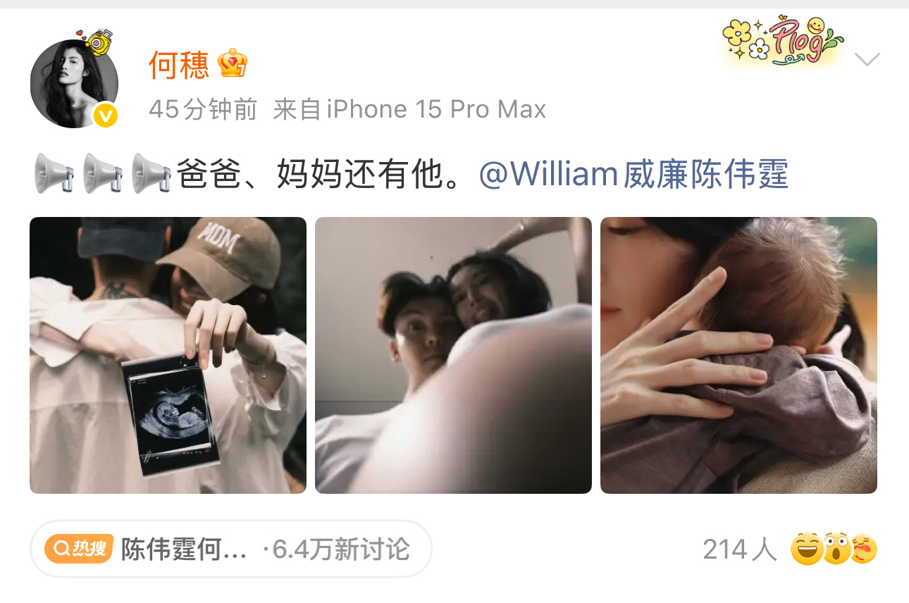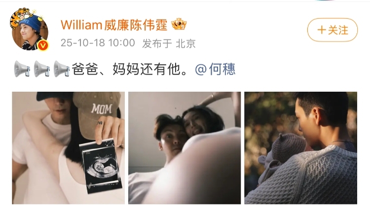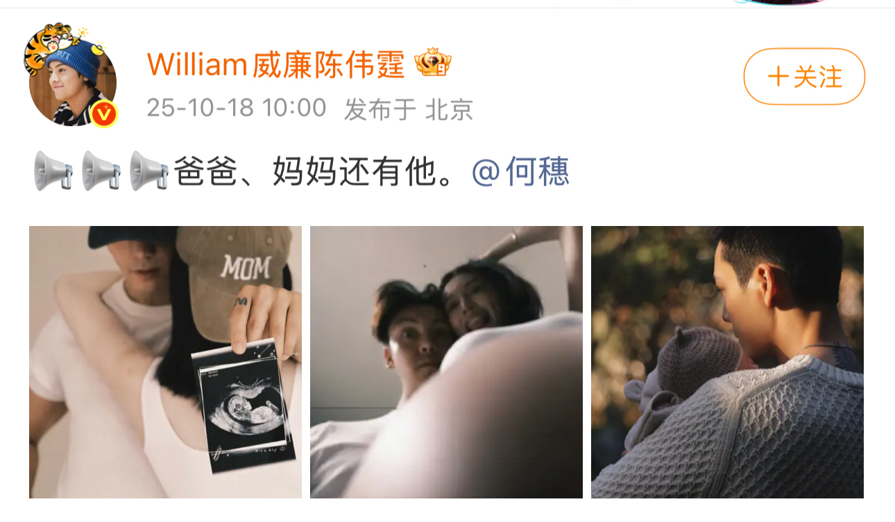10月18日,知名演员陈伟霆与知名超模何穗在微博同步晒照并配文“爸爸、妈妈还有他”,甜蜜@对方,官宣生子。