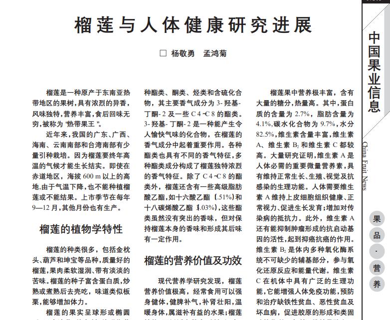 [1]杨敬勇,孟鸿菊.榴莲与人体健康研究进展[J].中国果业信息,2007,(01):29-30.