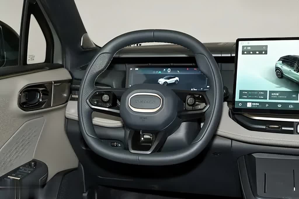 中控布局强调实用与便捷。电子怀挡取代传统挡杆,为中控下方留出镂空储物空间,可放置手提包等物品。方向盘为平底三辐设计,包覆皮质,手感饱满,按键布局合理,包含语音控制、音量调节、驾驶模式切换等功能。中控屏下保留少量物理按键,主要控制空调与除雾,便于盲操作。整体操作逻辑清晰,科技感与实用性兼顾。