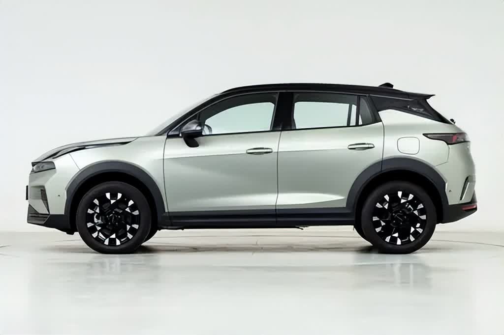 车身侧面比例协调,整体姿态紧凑。车顶采用悬浮式设计,搭配略微下压的溜背造型,使整车在保持SUV实用特性的同时又具备轿跑的流动感。腰线从前翼子板起笔,贯穿至尾灯区域,形成Z形折线,强化了车身的层次感与立体感。下方的防擦饰板与双色轮拱装饰,进一步提升视觉厚重感。
