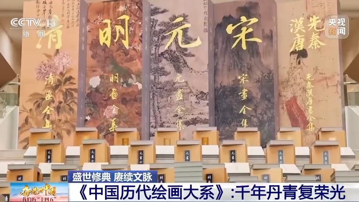 《中国历代绘画大系》的编纂,为12000余件套中国古代画作建立起精准的数字化档案,先后编纂出版《先秦汉唐画全集》《宋画全集》《元画全集》《明画全集》《清画全集》共64卷244册。(央视)