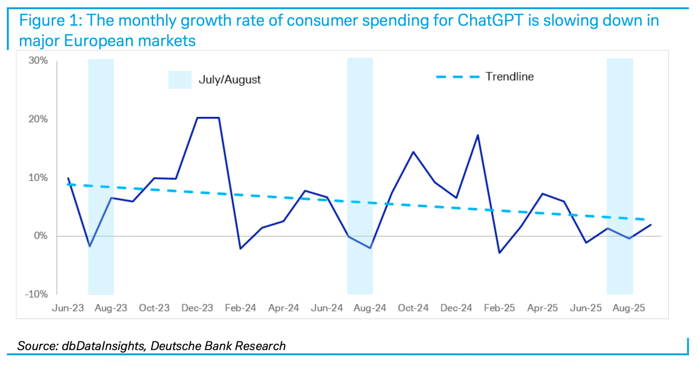 IT之家从报道中获悉,德意志银行分析显示,OpenAI 订阅价值在 2023 年初大幅增长后,过去四个月在主要欧洲市场已趋于平稳。