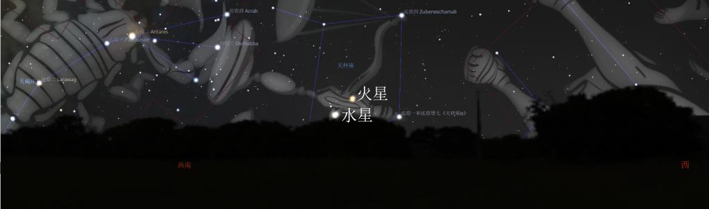 10月21日,以北京为例,傍晚时分可见的水星、火星。(Stellarium星图模拟)