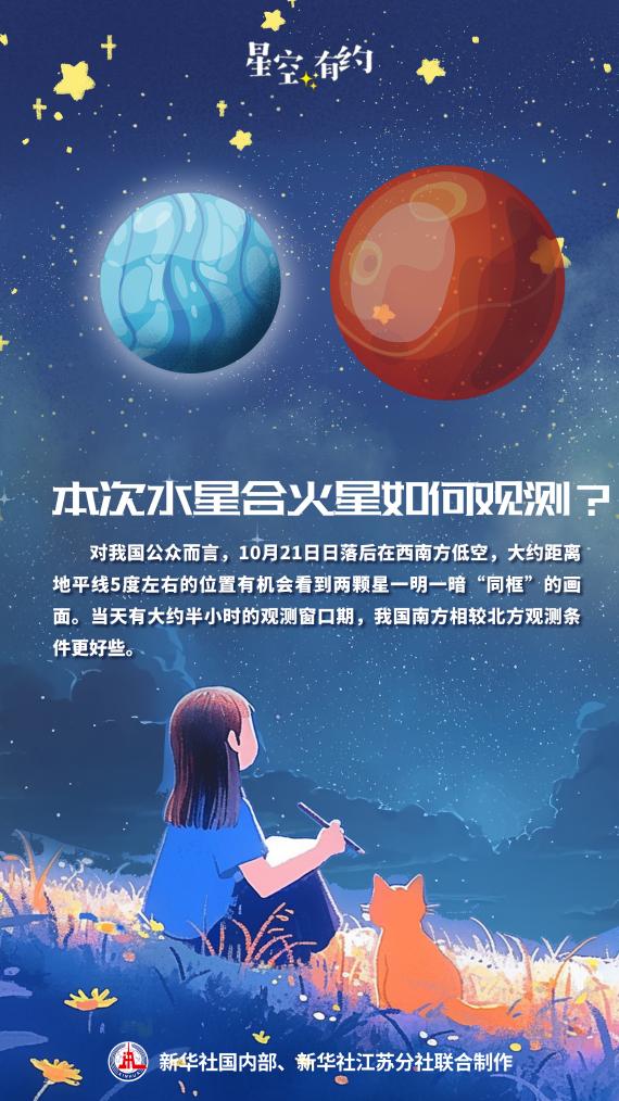 10月21日将迎水星合火星。当天日落后,水、火两星将“携手”出现在西南方低空,我国公众有机会看到水星、火星一明一暗“同框”的“星空约会”。