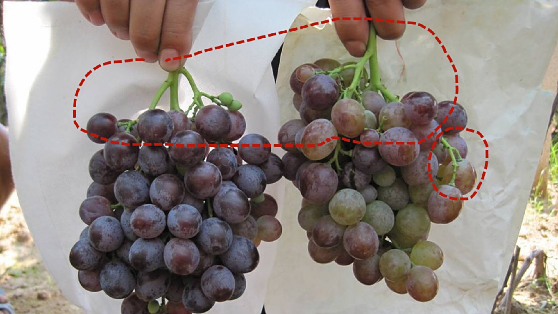 他指着藤上两串对比鲜明的葡萄,“你看,自然生长的葡萄,每颗之间都有空隙。”