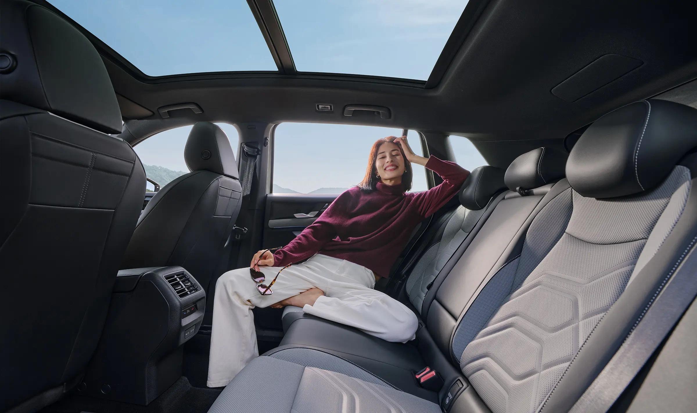 空间方面,后排腿部空间还算宽敞,而且后排座椅支持靠背调节,想要坐直一些或半躺都可以,不过座椅内部填充偏硬,而且坐垫较短,影响乘坐舒适性。还有一点需要注意,该车的后排地台隆起较高,影响后排中间乘客的腿部姿态。