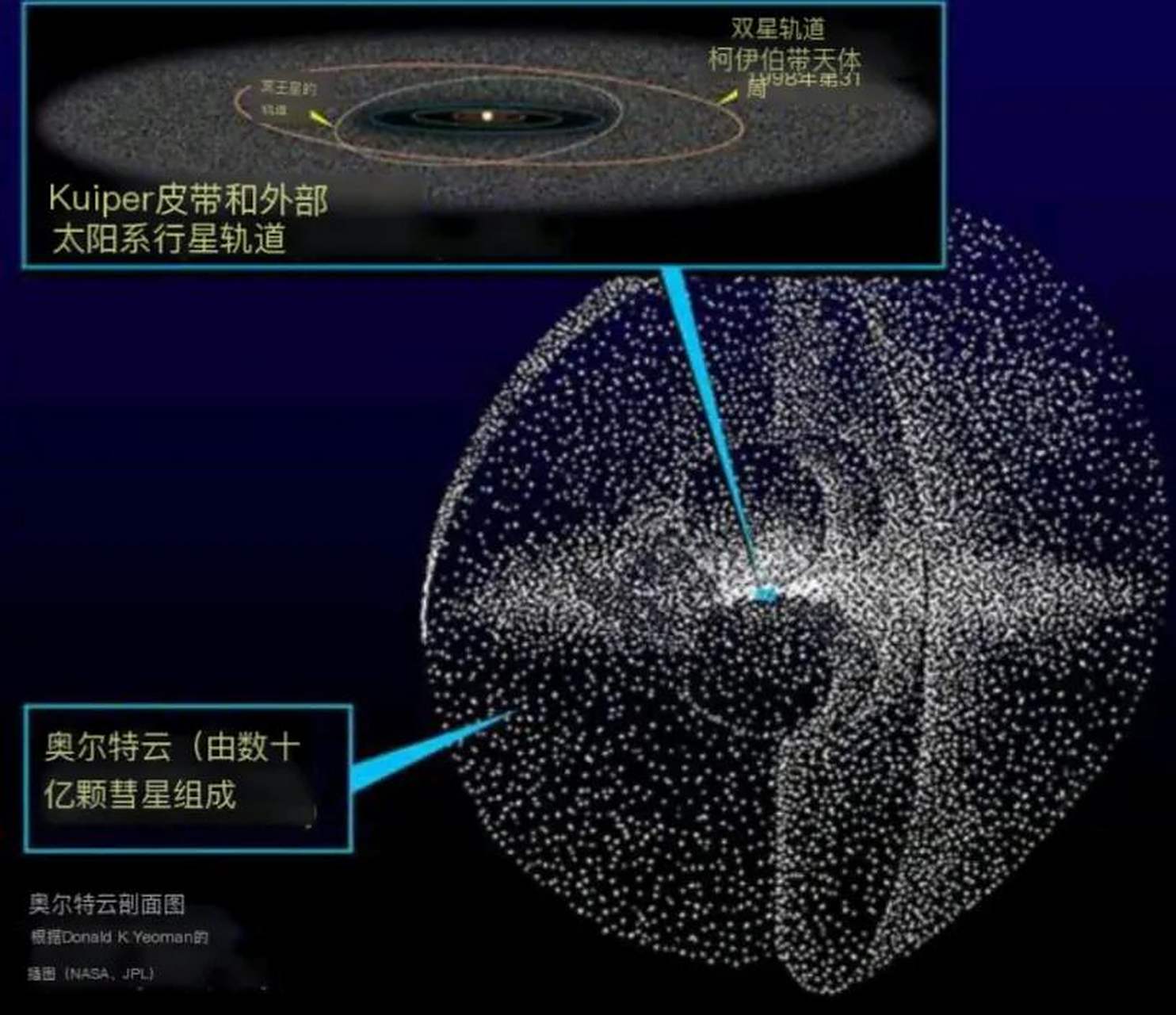 在1950年,荷兰天文学家奥尔特提出了一个大胆的猜想,认为整个太阳系被一个巨大的球状云团所包裹着,也就是所谓的奥尔特云。他们由众多不活跃的彗星构成,直径在两光年左右。但可惜因为距离的遥远,他至今还未被实际的观测到,也不可能被观测到。