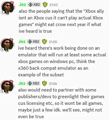 在XB2 Discord频道的对话中,Jez Corden解释称,微软正在研发一款可让Xbox 360及其他主机游戏在ROG Ally掌机上运行的模拟器。不过,由于种种复杂因素,支持的游戏数量将受到限制。