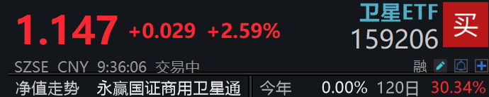 截至9:36,卫星ETF(159206)上涨2.59%,成分股星网宇达、天奥电子涨停,盟升电子、中国卫星等个股跟涨。