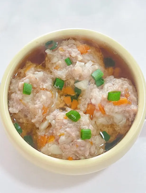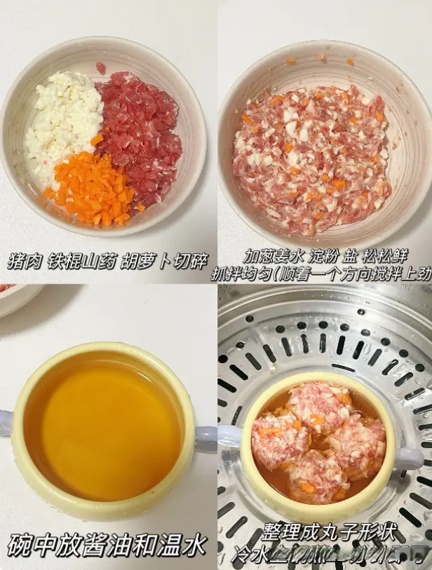 材料:适量猪肉,适量山药,适量胡萝卜,葱姜水,玉米淀粉,食用盐,鸡精,酱油温水,葱花。