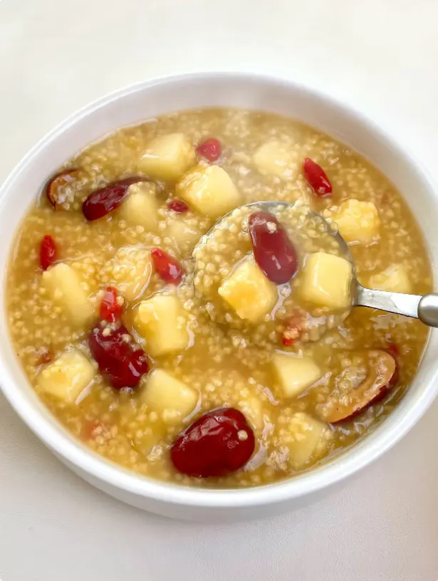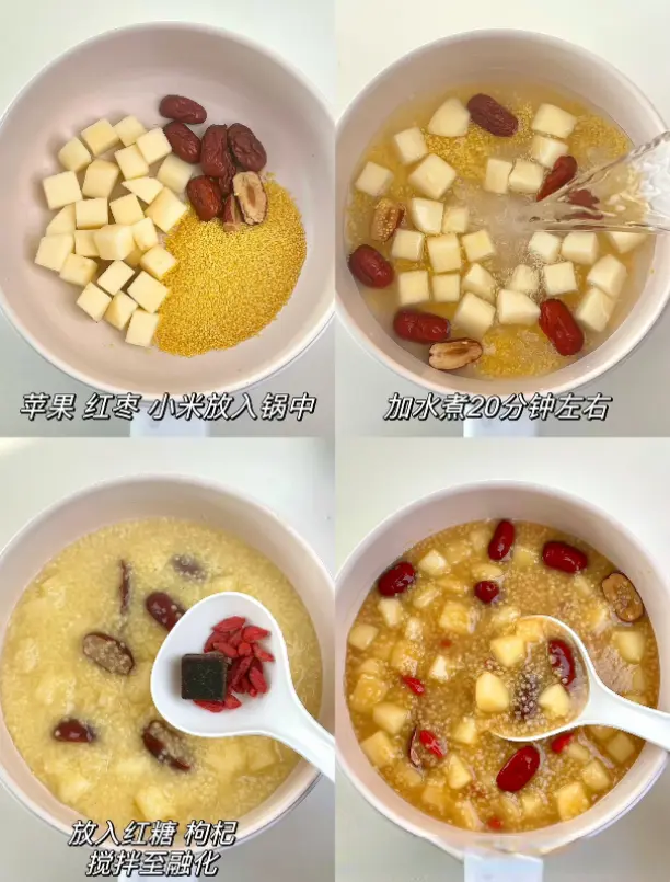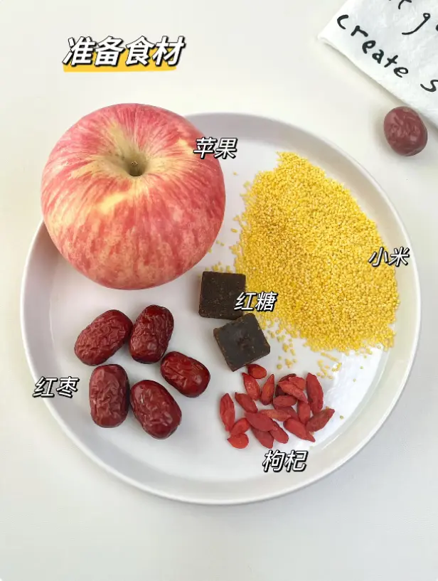 材料:一个苹果,一小把小米,2块红糖,适量红枣,适量枸杞。