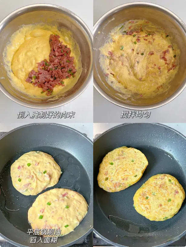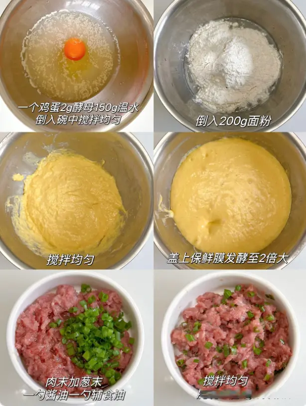 材料:200克面粉,一个鸡蛋,2克酵母,150毫升温水,适量猪肉末,酱油,食用油。