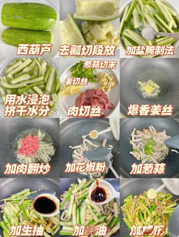 材料:2根西葫芦,适量盐,猪肉丝,生姜,葱蒜末,花椒粉,生抽,蚝油,鸡精。