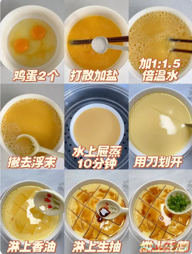 材料:2个鸡蛋,适量盐,香油,生抽, 葱花。