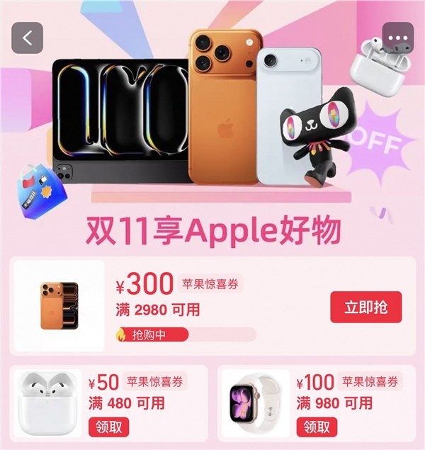 天猫Apple Store官方旗舰店10月20日晚开启双11活动,iPhone 17 Pro系列成为焦点,到手价8699元起,Pro Max为9699元起,但标准版未参与降价。Apple Watch Series 11优惠后低至2141元,SE3仅1453元起。AirPods 4降至611元,降噪版917元。活动提