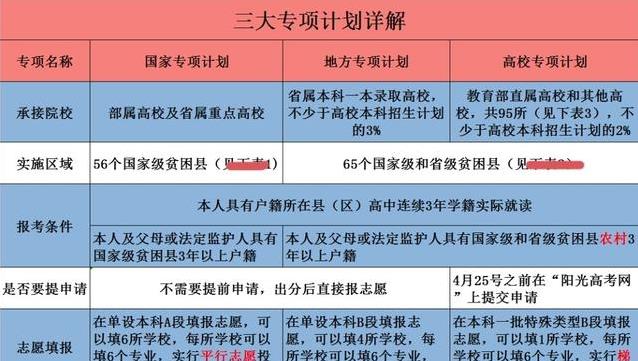 先说清楚,这三个专项计划是什么。国家专项是为贫困地区学生准备的,帮他们上好大学。高校专项是部分顶尖大学给农村学生的特别通道。地方专项则是地方高校为本地农村孩子提供的机会。每个计划的录取时间都不一样,完全不冲突。孩子报了名,哪怕前面没录上,还能继续试后面的机会。