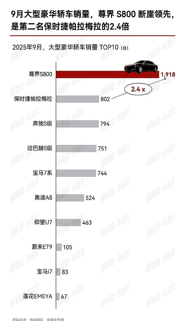就在刚过去的9月,尊界S800用1896辆的销量,断层式领先!一举超越奔驰S级、迈巴赫、帕梅和宝马7系等传统豪强,甚至是第二名销量的2.4倍,这回真的将传统豪华旗舰轿车按在地上“摩擦”了。