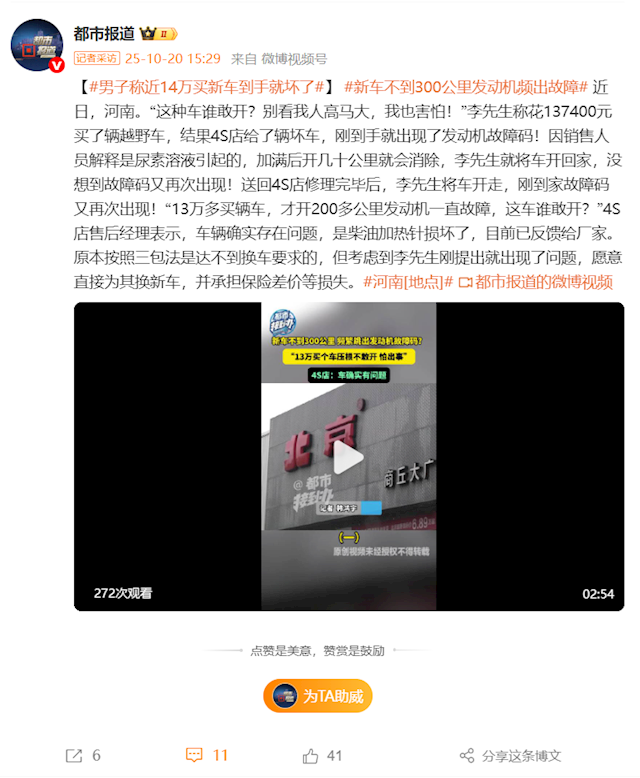 男子花13万多买越野车 结果新车不到300公里柴油发动机频出故障
