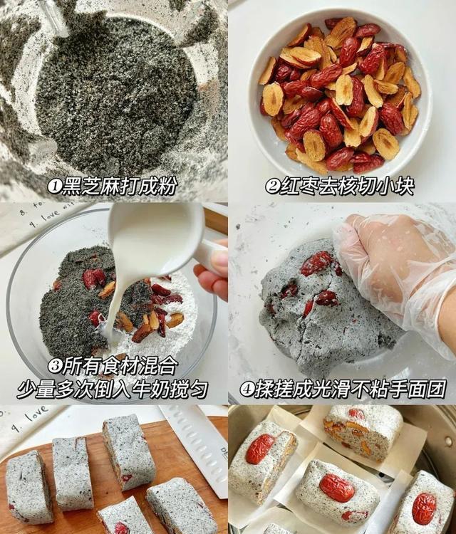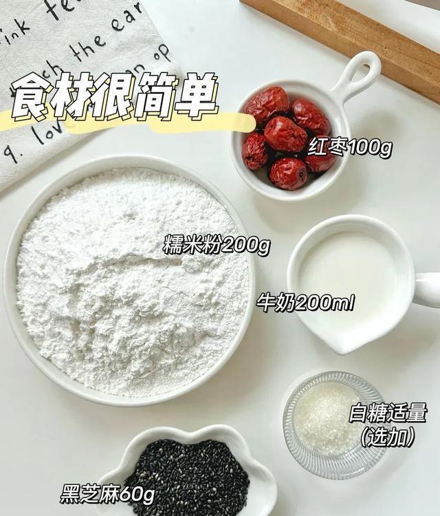 食材:黑芝麻60g、糯米粉200g、牛奶200ml、红枣100g、白糖(按口味添加)