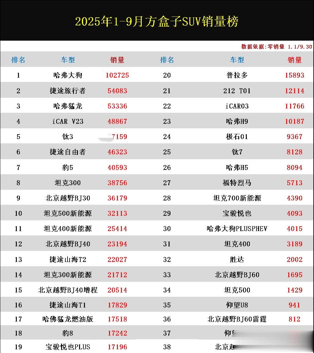 导读:十月份,今年前9月的汽车销量数据也已经陆续出炉了!那么,在这个车市竞争激烈的时代,方盒子SUV市场各车型的销量表现如何呢?今天我们一起来看看吧?根据数据显示,2025年1-9月共有38款车型上榜,其中有3款