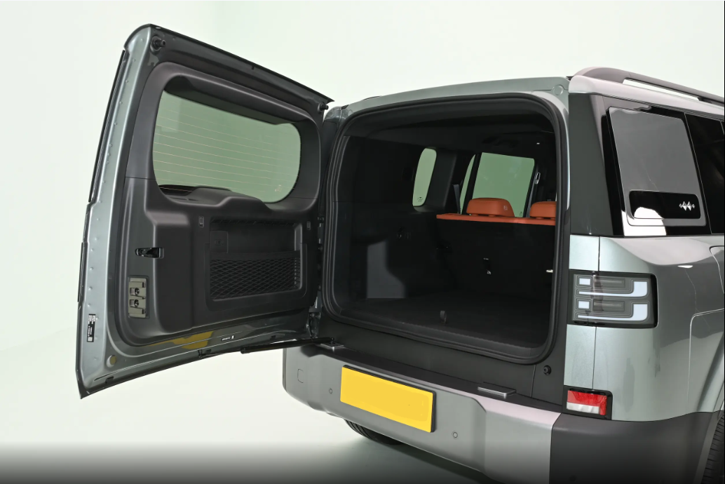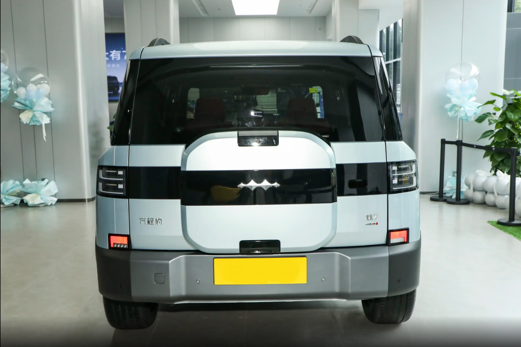 车尾设计延续了整车硬朗方正的设计语言,同时融入了诸多实用性与科技感的细节元素。尾灯组采用极具辨识度的双层方形结构,由128颗LED灯珠组成,外层为红色示宽灯带,内层集成琥珀色转向灯,底部还嵌入了蓝色辅助驾驶指示灯,在夜间能提供出色的警示效果。尾门采用左开式设计,经典的"小书包"外挂式工具箱采用轻量化铝合金材质,表面经过防刮处理,内部空间经过精心规划,可容纳全套越野救援工具。后保险杠采用一体成型的银色高强钢护板,不仅提升了视觉冲击力,更能有效防护底盘关键部位。