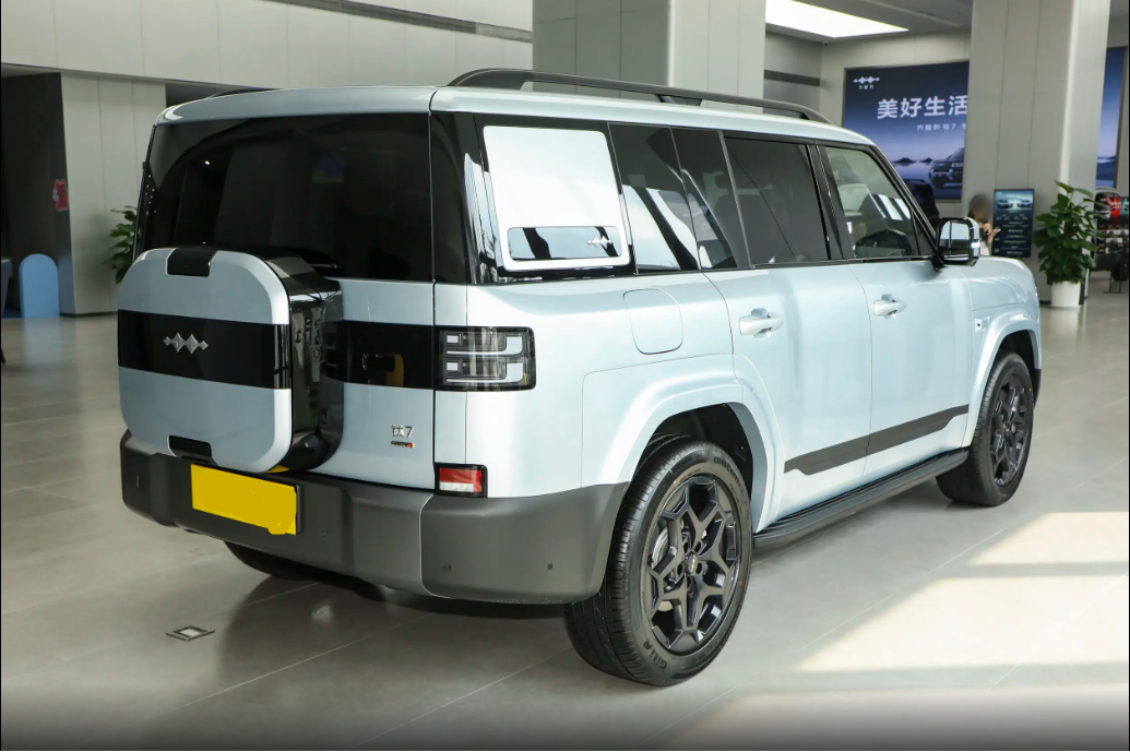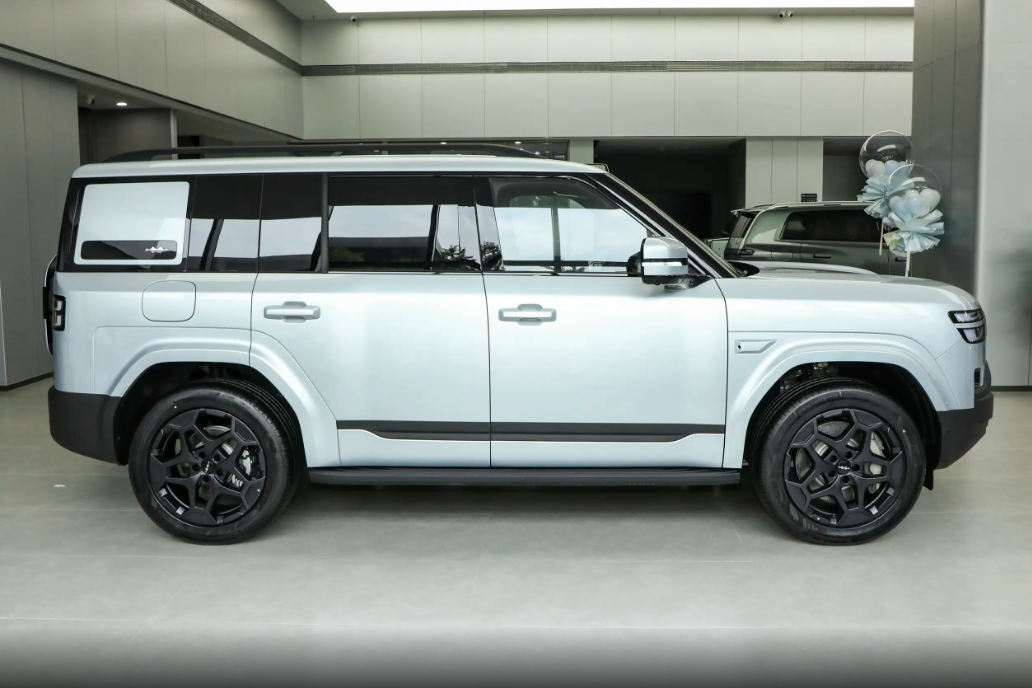 钛7的侧面设计则是"方盒子"设计风格,整车采用横平竖直的几何线条勾勒,彰显出硬朗大气的视觉风格。平直的车顶线条不仅提升了内部空间利用率,更与黑色铝合金行李架相得益彰,既实用又充满户外气息。车窗区域采用与车身同色的哑光饰板包裹,下方镶嵌着印有方程豹品牌LOGO的黑色高光饰条,这种撞色设计大幅提升了品牌辨识度。车门把手延续传统的外拉式设计,操作便捷可靠,前后轮拱均采用外扩式设计,搭配与车身同色的宽体轮眉,营造出强烈的肌肉感。固定式侧踏板采用防滑铝合金材质,配合熏黑处理的大尺寸轮毂,在硬派风格中又透露出精致的时尚气息。