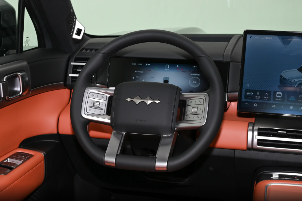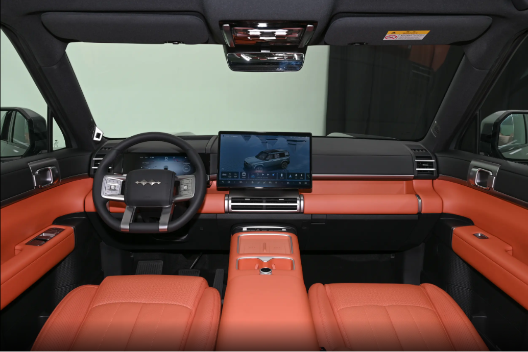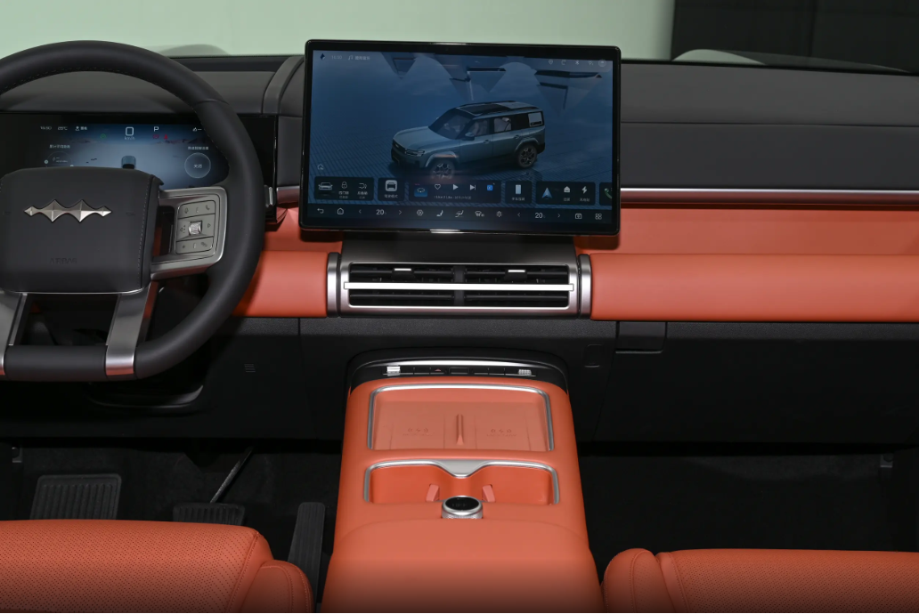 内饰设计方面,可以看出方程豹钛7的车内采用了简洁且规则的设计风格,并没有传统SUV车型内饰的沉闷感,把“方”和“圆”两种元素结合得比较好。15.6英寸悬浮式中控屏和12.3英寸全液晶仪表组合,搭配27英寸W-HUD抬头显示,配备四辐式多功能方向盘搭配怀挡式换挡,相比豹系列车型的飞机档释放了中控台区域空间。