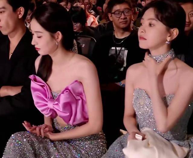 就比如章若楠和王玉雯,两人都穿银色的抹胸裙子。