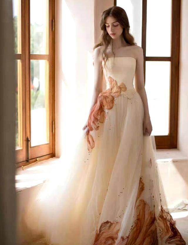 这条礼服是以白色为基础颜色,是抹胸的设计,在白色上面酝酿了印花元素,让白色变得没有那么单调了。
