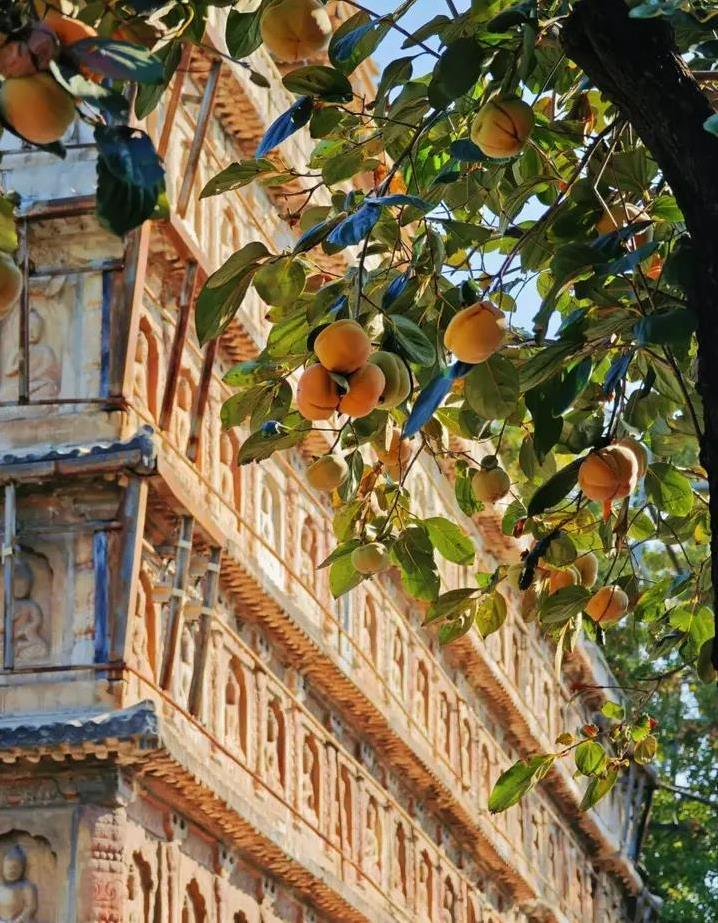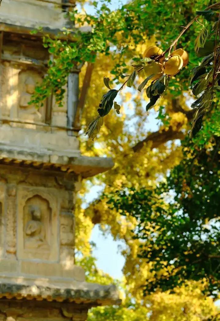 寺里的秋景不只有柿子。银杏树刚开始泛黄,跟橙红的柿子一搭,颜色美得像画。阳光从树叶缝隙洒下来,地上光影斑驳,走在路上,感觉整个人都轻松了。秋风轻轻吹过,树叶沙沙响,像在跟你聊天。