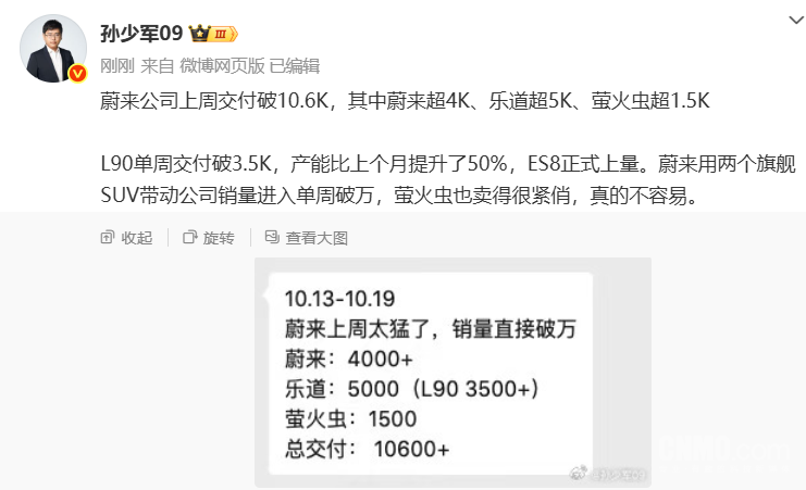 【CNMO科技消息】CNMO注意到,10月21日,有博主曝蔚来上周(10月13日-10月19日)交付量突破10600辆。其中,蔚来品牌(含ES8、ET7等)交付量超4000辆,约占38%;乐道品牌交付量为5000辆(L90交付量超3500辆,占总量的33%,同时其