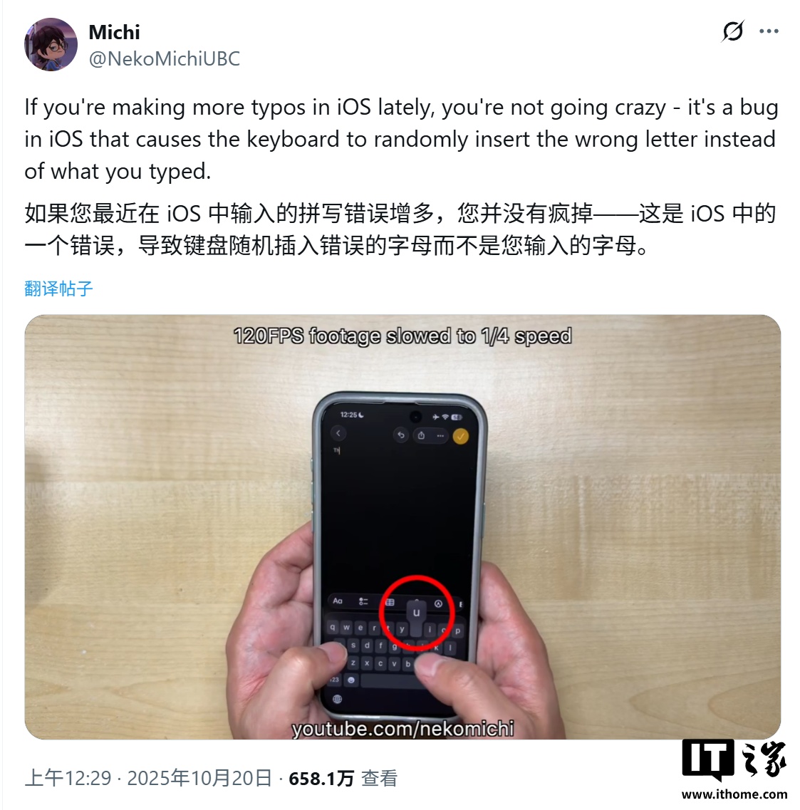 IT之家 10 月 21 日消息,消息源 @NekoMichiUBC 昨日(10 月 20 日)在 X 平台发布推文,分享了一段慢镜头视频,声称苹果 iOS 26 系统存在 BUG,导致 iPhone 用户出现更多的拼写错误。 消息源通过慢镜头记录了敲击键盘到界面文字