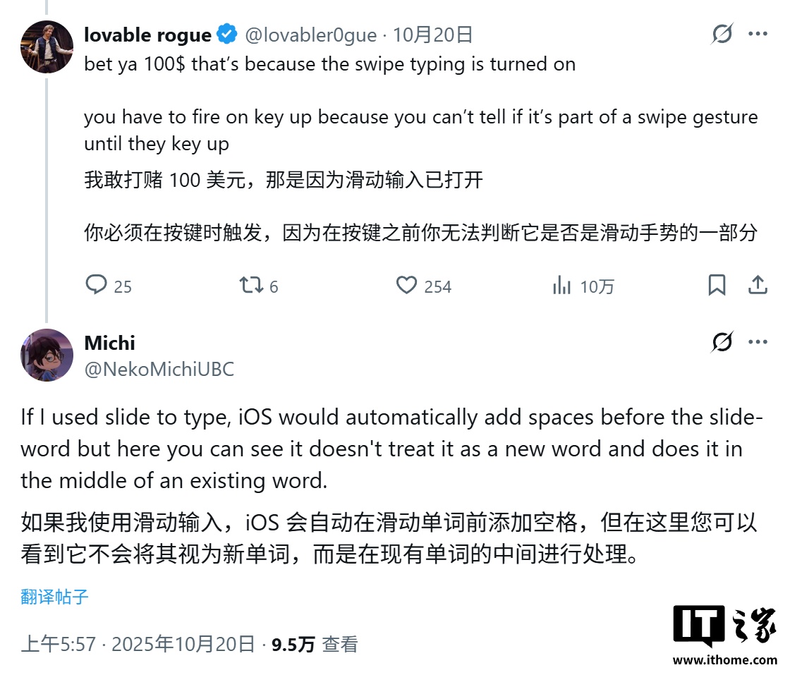 也有网友指出导致该问题的魁首可能是“滑动输入”,不过 @NekoMichiUBC 回应称:“如果我使用滑动输入,iOS 会自动在滑动单词前添加空格,但在这里您可以看到它不会将其视为新单词,而是在现有单词的中间进行处理。”